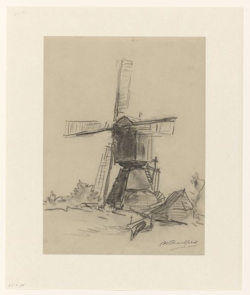Willem Bastiaan Tholen created this etching, titled 'Two Windmills in a Landscape', using black ink on paper. Windmills like these were once ubiquitous features of the Dutch landscape, essential for draining the low-lying land and powering industry. Tholen made this print at a time of great social and economic change in the Netherlands. Industrialisation was rapidly transforming the country, and traditional ways of life were disappearing. Artists like Tholen often looked back to the past, idealizing the simplicity and tranquility of rural life. By focusing on windmills, Tholen evokes a sense of national identity, connecting to a rich cultural heritage. As a social historian, I might explore how images of windmills were used in Dutch national branding, and how they were deployed in debates about progress and modernisation. By consulting archives, newspapers, and other historical sources, we can gain a deeper understanding of the cultural work that this seemingly simple image performs.