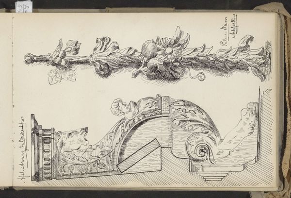 This drawing, titled "Design for a Corner of a Ceiling" was made anonymously with pen and ink on paper. We can see the material intention of the design in the artist’s notes, as he annotates the drawing with considerations for materials and processes for the architectural detail. The drawing depicts a design for a corner of a ceiling, showcasing ornate decorations made of marble, plaster, and painted figures. The artist notes the use of faux gold leaf, and marble in varied colors, suggesting an interest in materiality, color and texture. This emphasis on detailing is characteristic of luxury architectural design and speaks to the skilled labor required to bring such visions to life. We can almost imagine the meticulous work of the plasterers, carvers, and painters who would have transformed this design into a tangible reality. Paying attention to the materials and the processes involved allows us to appreciate the cultural significance and the hierarchies of labor embedded in the visual artwork.