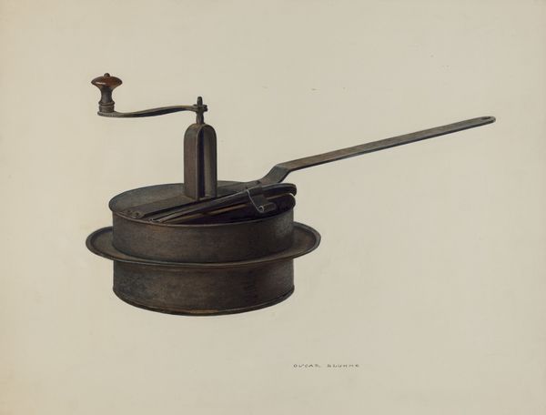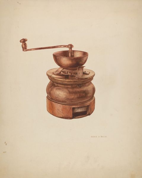 D.J. Grant made this lovely watercolor of a coffee grinder sometime in the 20th century. The color here is so subtle, it’s like the ghost of coffee itself. There's a real focus on the texture of the wood, the artist really digs into the granular details. Look at the base of the grinder, the way it catches the light. The brown on cream feels nostalgic, sepia-toned, like an old photograph. I love the way the artist renders the metal parts, that little glint on the handle, the screw at the top. It reminds me of the precision of an Ingres drawing, even though the subject matter is so humble. There's a real care and attention here, a reverence for the everyday object. It reminds me of the Shaker commitment to beauty in simple things, a celebration of functionality. It makes you think about where things come from.