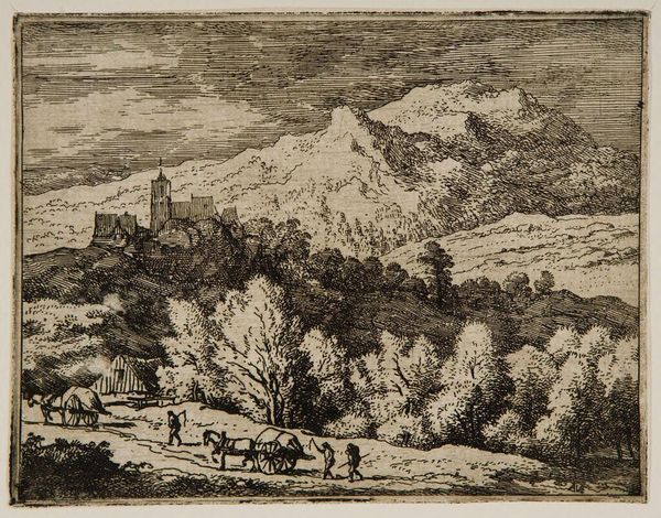 Allart van Everdingen created "The Two Carts" using etching, which allows for intricate details and tonal gradations. The stark contrast between light and shadow immediately captures our attention, creating a dramatic, almost theatrical landscape. The composition is structured around a winding path that leads the eye from the foreground, where two carts are being pulled along, toward a fortified building on a hill and a towering mountain in the background. Everdingen masterfully uses line and texture to distinguish the various elements of the scene. The rough, dense lines of the foliage contrast with the smoother, more delicate lines used to depict the sky and distant mountain. This work invites us to consider how Everdingen uses the semiotic system of landscape to convey not just a scene but a sense of scale and human activity within the vastness of nature. The tension between the detailed foreground and the expansive background challenges fixed perspectives, and the careful arrangement of forms creates a dynamic interplay between depth and surface. It is a testament to how etching can transform a simple scene into a profound visual experience.