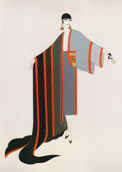 Curator: Isn't she striking? This is "Vamps, Circe" by Erté. I see her as an ink drawing, an exploration in historical fashion. Editor: My first thought? Allure. She just radiates a kind of mysterious, magnetic pull. There's almost something vampiric, pun intended, in the confidence of her gaze and those slender, slightly unsettling arms. Curator: That knowing confidence is Erté’s signature! He captured a spirit of seductive power that defined the Art Deco woman. This woman, named Circe, holds the magic; it could easily have become an invitation, if it weren't as aloof as this work. Look at her gown. Vertical lines broken up by tiny sinuous golden ornaments, cascading down to a trail of red. A symbol, perhaps, of power. Editor: Symbols speak volumes. Erté’s figure draws so much from those familiar narratives, doesn't she? Circe—the temptress. Red as blood; its placement across her legs suggestive of how Circe can, without scruple, beguile whomever crosses her path, just as the classical figure. Curator: It's all suggestion, isn’t it? Erté leaves so much unsaid. But that Art Deco style… It’s not just about beautiful clothes and figures. It's this sense of a controlled, decadent world, brimming with untold stories. Fashion became this entire language that only a handful spoke in that time. The lines, they mimic control in chaos. A statement on her dominance over these narratives of love, of lust and trust. Editor: Exactly. The decorative frame too—it seems like an aesthetic restraint imposed upon a woman who defies those limits, doesn't it? Even her hair, the jet-black perfectly sculptured bob, a signifier for emancipation! Circe appears as a beacon for those trapped. Erté knew this; understood what women wanted and craved beyond being mere portraits. The dress is daring for its time too. And still! Curator: Daring indeed. And the medium; ink—simple, elegant, timeless! Like Circe, really. This woman is just that! Enduring. I bet she keeps enchanting centuries from now, with every drop of ink left untouched on this sheet. Editor: Absolutely. "Vamps, Circe," a glimpse into an age of allure and empowerment, all intertwined. I believe her magic keeps drawing people to her story today.