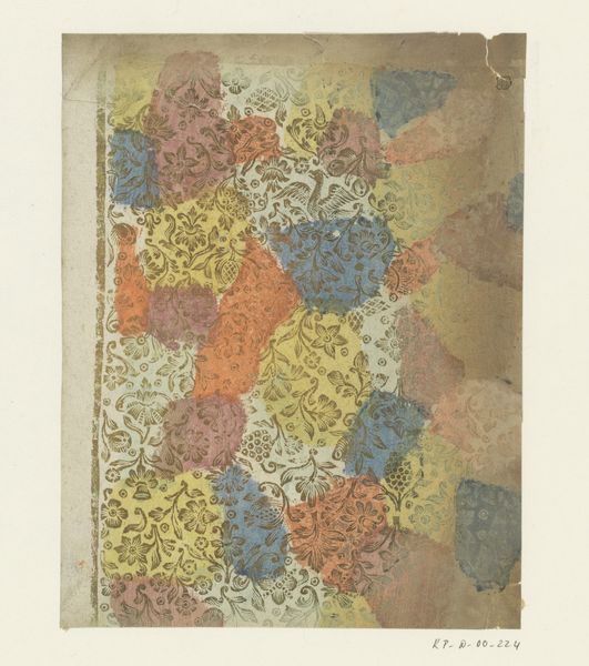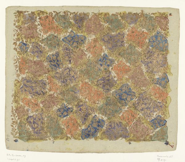 Editor: This is "Blad met ranken met bloemen en vruchten," a print by Johann Carl Munck, made sometime between 1750 and 1794. It's a stunning pattern. All of these layered natural elements, and the colors, feel quite modern, yet grounded in tradition. What can you tell me about it? Curator: It’s fascinating to consider how this kind of imagery circulated. Rococo art, with its emphasis on the decorative, played a crucial role in shaping social tastes. The use of woodcut for printing makes me wonder about its purpose: was this a design intended for wider dissemination, perhaps influencing textile production or wallpaper? Editor: It makes me think of wallpaper too. Were there other political aspects that dictated its usage? Curator: Absolutely. Floral patterns were incredibly popular. But it goes beyond simple aesthetics. Patterns like this signified wealth and status; access to such decorative arts was often determined by socio-economic standing. Look at the intricate detail; reproducing this on a larger scale meant employing skilled artisans. Who controlled the means of production, and for whom were these patterns intended? Editor: So the pattern itself is a status symbol? Almost like a subtle form of propaganda? Curator: In a way, yes. It visually reinforced the hierarchies of the time. Art isn't just about beauty, it is very much related to the cultural history it sprung from. Think about who *didn’t* have access to such refined imagery. It reveals power structures that existed. What do you think, seeing it in that context? Editor: That's powerful. I had just considered it pretty at first glance. I will never look at art the same again! Curator: Precisely! And that constant questioning – that’s what keeps art history so engaging.
