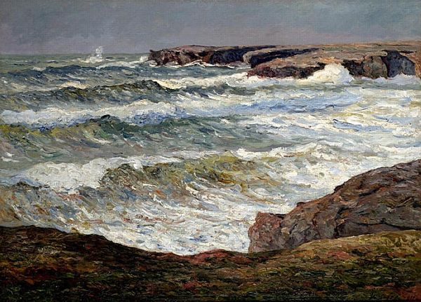 Editor: Here we have Maurice Braun's "San Diego Shores," painted in 1928 using oil paints. There's a raw energy in how the waves crash against the rocks. How would you interpret this particular landscape, especially considering when it was created? Curator: It's interesting that you call it energetic. Braun was painting this right before the Great Depression, wasn’t he? Look at the visual composition; the wildness of the sea juxtaposed against the stability of the land. I think this painting can be viewed as a reflection of the social climate of the time. Braun might be unconsciously mirroring the precarity of economic systems soon to crumble, but cloaked within what appears to be typical landscape imagery. Do you agree that this may reveal social unrest? Editor: That’s a really interesting idea, viewing the landscape as a metaphor. I hadn’t considered that. It also has strong ties with impressionism but somehow has this stark quality of realism. I can't quite connect that idea into society! Curator: Well, consider this. Braun spent time studying in Europe and was part of a burgeoning art scene in Southern California at the time. What kind of impact do you think the institutional art market, specifically galleries exhibiting this type of work, would have had on an artist like Braun? Editor: I imagine those galleries played a crucial role, almost curating a particular image of California, a marketable image of both raw natural beauty and stability... perhaps masking some of the precarity you mentioned earlier? Curator: Exactly! By promoting these landscapes, galleries contributed to the narrative of California as an untouched paradise. And in the backdrop were other less positive socioeconomic conditions and political agendas, concealed by such artwork, or worse still - actively sanitizing its historical context. Editor: So the painting functions almost as a form of… propaganda? Wow. I never thought of landscape painting having so much depth and context! Curator: Precisely. It just shows how much the politics of imagery are part of even the seemingly innocuous art forms. Hopefully you found our brief conversation here an enlightening one. Editor: Definitely! I see much more than just crashing waves now.