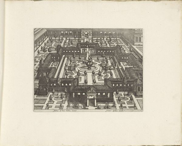This print, "Tuin met centrale parterre met in het midden een fontein," of a garden with a central parterre and fountain, at the Rijksmuseum, was made anonymously using the technique of etching. Etching is an indirect intaglio process, a chemical rather than a purely mechanical means to incise a design into a metal plate. The etcher covers a metal plate with a waxy ground, then scratches an image into it with a needle. The plate is then immersed in acid, which bites into the exposed metal lines. The longer the plate remains in the acid, the deeper and wider the lines become. In this case, the artist has carefully rendered the formal garden design through a complex network of lines. The controlled and precise execution of the etched lines mimics the manicured forms of the garden itself. The amount of time and labor involved in creating the print reflects the resources and leisure associated with the aristocratic lifestyle it depicts. The print acts as a testament to both the artistry of the printmaker and the wealth required to maintain such an elaborate garden. The artwork's meaning resides in the convergence of materials, technique, and the social context it represents, blurring the boundaries between art and craft.