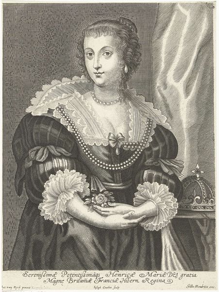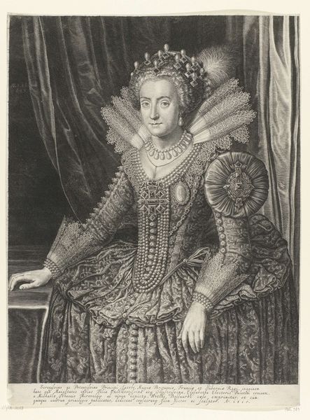 Editor: We're looking at a print here, "Portret van Maria Clara Croff, markiezin van Havré," created sometime between 1633 and 1673. It's an engraving. It’s very formal, stately. I’m curious, how do you interpret this portrait? Curator: It’s important to situate Maria Clara within her historical context. As a noblewoman, her identity was intrinsically tied to lineage and social status. This portrait isn't just about capturing her likeness; it's about visually representing her power and position within a patriarchal structure. What does her elaborate attire signify to you? Editor: Well, clearly, wealth and status, the pearls, the lace… It feels almost performative. Curator: Exactly. Baroque portraiture often functioned as a form of propaganda. This image reinforces the rigid hierarchies of the time. Consider how her gaze avoids direct engagement; it hints at a certain reserve, perhaps reflecting the limited agency afforded to women of her station, even within positions of power. Do you see a sense of the tensions present during the Baroque? Editor: I do, now that you mention it. It's a very controlled image, yet there’s almost a vulnerability in her expression. Almost a struggle against the constraints you mention. Curator: Precisely. We must examine the tensions inherent in representing individuals enmeshed in complex systems of power. Editor: This really highlights how even something as seemingly simple as a portrait can reveal so much about the societal dynamics of its time. I never really thought of portraiture this way before. Curator: Reflecting on such dynamics enriches our appreciation, doesn’t it? It opens our understanding of power and societal expectations through history.