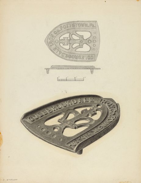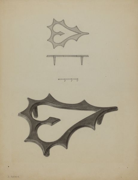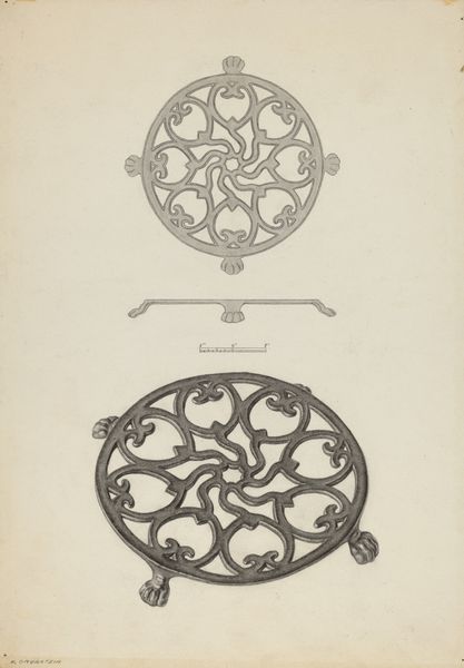 This is Benjamin Resnick's drawing of a trivet, created sometime between 1855 and 1995 with graphite on paper. Notice how the artist has arranged the trivet in three views, creating a sense of looking at the same form from different angles. The surface of the paper is lightly textured, allowing the graphite to catch in the tooth of the paper, resulting in a granular, almost hazy quality. Look closely at how Resnick builds up tone through layers of graphite, particularly in the shadows and along the edges of the trivet. The lines are precise, yet there's a softness that keeps it from feeling overly mechanical, especially when he renders the legs. The way the object is rendered in light and shadow gives it an interesting sense of depth, as if we're looking at a real object rather than just a drawing. There's a quiet intimacy, as if Resnick is inviting us to share in his careful observation of the everyday. I'm reminded of the architectural drawings of Charles Sheeler, who elevated industrial design to high art. Ultimately, this is a work that asks us to reconsider our relationship with the overlooked objects in our lives.