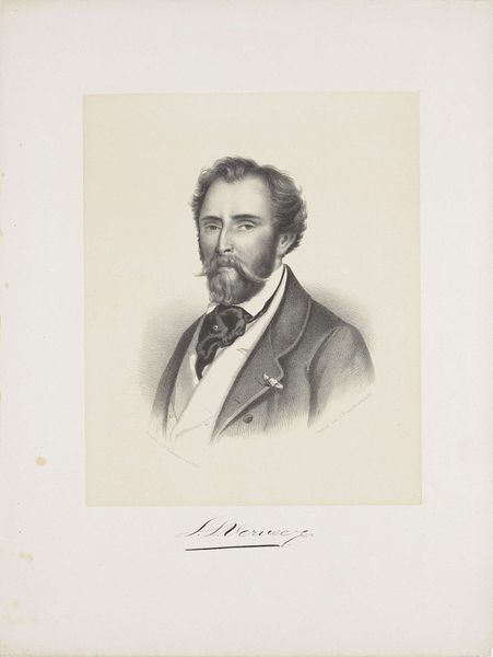 This is Franciscus Bernardus Waanders' portrait of an unknown man, currently held at the Rijksmuseum, executed using lithography. The composition is immediately striking for its study in contrasts. The subject emerges from a diffused, almost hazy background, achieved through delicate gradations of tone. Waanders masterfully uses chiaroscuro to sculpt the face and form, drawing our eye to the man's gaze, which is directed off to the side, lending an air of contemplative detachment. The lithographic technique here is not merely representational; it actively shapes the perception of the subject. The fine lines create texture, particularly in the hair and clothing, which serve to define his social standing. The very form of the portrait—its focus on the individual—speaks to broader cultural values of the time, particularly the rise of individualism. Consider how Waanders invites us to look beyond the surface, engaging with questions of identity and representation that continue to resonate.