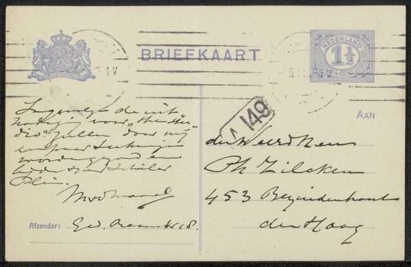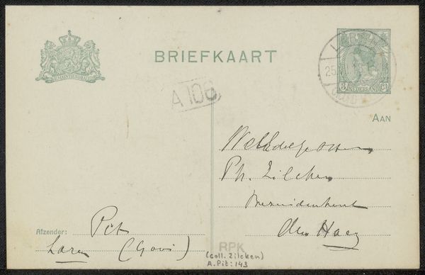 This postcard was written by Willem Byvanck, a Dutch scholar, to Philip Zilcken, an artist, critic, and art dealer, sometime in the late 19th or early 20th century. While seemingly a mundane object, it offers a glimpse into the artistic networks of the Netherlands during this period. The postcard itself, with its printed "BRIEFKAART" heading, the Dutch coat of arms, and space for a stamp, reflects the rise of mass communication and postal services. The handwritten message reveals a personal connection between Byvanck and Zilcken, suggesting a community of artists, critics and intellectuals exchanging ideas and supporting each other's work. Zilcken was a prominent figure in the art world, which makes Byvanck's choice to write to him significant. Was he seeking Zilcken’s opinion? Was he trying to sell his work through Zilcken's gallery? Historical resources like letters, exhibition catalogues, and biographical information about Byvanck and Zilcken can help us understand the institutional structures and cultural values that shaped their artistic world. This small piece of paper reminds us that art is embedded in social and institutional contexts.