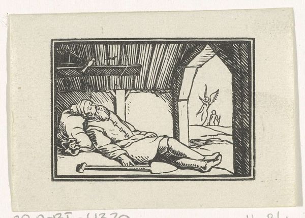 Curator: Here we have “Sleeping Angel Beside a Child’s Bed” by Christoffel van Sichem II, made around 1628. It’s currently housed here at the Rijksmuseum. Editor: Wow, it feels…intimate, almost claustrophobic. All those incredibly precise lines create such a textured density. It’s like a dream captured with a very sharp needle. Curator: That precision comes from the engraving technique, a hallmark of Baroque printmaking. Consider how line, as a visual element, communicates cultural and religious ideas at the time. Editor: Definitely. It reminds me how fragile children used to be seen, I suppose still are in some places, needing constant divine supervision to get past their vulnerable youth and its constant threats of peril. Curator: Yes, images like these were meant to emphasize the ever-presence of the divine in daily life, an idea perpetuated through widespread print distribution, which itself reveals a sophisticated market system that reached varied audiences, from commoners to clergy. Editor: The canopy bed looming over the child, that sleeping angel huddled on the floor like an exhausted parent…It's quite a strong sense of the unseen forces acting to keep this young being safe. Curator: Note that while seemingly benevolent, this protection narrative further entrenches religious institutions' role in societal structures. It visually propagates theological dogma about destiny and afterlife. Editor: You are totally right. Though seeing it that way pulls some of the poetry from the piece, but necessary, of course. I think in our own era, images like these tend to exist more purely as sentimentality... maybe with some nostalgia thrown in. Curator: The sentimental angle wasn't always so... central, shall we say. But it demonstrates how images morph and are reassigned within culture and collective meaning. Editor: A poignant snapshot frozen for a few centuries. Now it leaves us to ponder protection, sleep, and old anxieties. Curator: And how they have become entangled within the sociopolitical framework over the past 400 years.