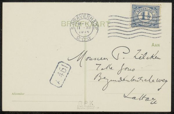 Curator: This unassuming item is a postcard titled “Briefkaart aan Philip Zilcken,” likely created between 1925 and 1927. It resides here at the Rijksmuseum. Editor: It's strikingly simple, a monochrome study in texture. The eye is drawn immediately to the penned text contrasting with the flat surface. Curator: Indeed. We see the social practice of correspondence rendered with the simplest of tools: ink on paper, a mass produced card turned singular. It shows a Modernist fascination with efficiency. Editor: Let's break down that composition. The hand-lettering becomes a series of shapes—linear arrangements creating rhythm, note the contrast between blocky address text, versus more fluid lines of “'S Gravenhage”. It seems as considered as any formal study in calligraphy. Curator: Consider, also, that this wasn’t meant as 'high art.' Postcards are intrinsically functional and disposable. Its survival challenges those assumptions and demonstrates artistic consideration present in everyday exchange. The very act of sending is a critical aspect of the work. Editor: Absolutely. Yet, aesthetically, there's that carefully placed stamp, the neat rows of address lines creating a sort of minimalist grid. It speaks to an economy of means, pushing visual harmony even through functional items. Curator: Moreover, postcards connected individuals within existing infrastructures and are deeply related to questions of industrialization and accessibility of culture during this period. The back of a postcard becomes a space of personal expression amidst global circulation. Editor: Its formal tension balances between design and pure function and hints at Modernism, this item becomes an example of intimate public interaction through visual means. It certainly makes me reflect on its lasting impact. Curator: It reminds us that the everyday object is fertile ground for both the artist’s exploration of their immediate material conditions and human interaction within technological advancement.