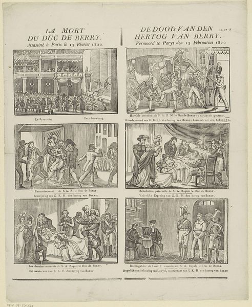 Curator: This is a print entitled "La mort du duc de Berry," dating from between 1830 and 1855, made by Erve H. Rynders. It’s currently held here at the Rijksmuseum. Editor: It reads almost like a…well, a storyboard for a rather grim historical event. There's a chilling formality in the arrangement of scenes. Curator: Precisely. It depicts, in sequence, the assassination of the Duke of Berry in 1820. Note how Rynders employs engraving to segment the narrative. Each frame functions almost as a discrete moment. Editor: I'm immediately struck by the contrast. On the one hand, you have this clean, almost classical compositional approach in each panel. Then you see the dramatic content. A theater, a murder, deathbeds. How were the frames perceived at the time, how did they interact with society? Curator: This was published during a period of significant political upheaval in Europe. The print would have served as a visual tool. The sequential nature allowed for a wider audience, even those who may not have been literate in the traditional sense, to grasp the narrative and political message. Consider also how print culture was instrumental in the dissemination of political sentiment. Editor: I wonder about the intended emotional impact. The romantic undertones are there in the depiction of grief, but is it meant to incite anger, sorrow, or simply serve as a detached record? The aesthetic restraint tempers any overwhelming sentimentalism. Is it merely for instructional use? Curator: Its emotional payload must have been complex and highly ambivalent. Certainly, the Romantic style amplified feelings surrounding the monarchy but there is a disarming formalism to the execution itself. Rynders has carefully modulated these formal characteristics to achieve a degree of historical objectivity. It’s not propaganda, but an ambivalent recounting. Editor: That tight grid-like layout lends an almost clinical quality, wouldn't you say? Each panel neatly contained, allowing a cool, reasoned engagement with a decidedly violent act. Very fitting to consider from a historical lens, offering society's outlook on this period. Curator: I concur, seeing Rynders' work today invites one to reconsider relationships of visual and political media. How does it continue to resonate now? Editor: Exactly. Now seeing this historical object through the formal approach, and the balance achieved, I now understand the object in its artistic qualities, and not just the historical content alone.