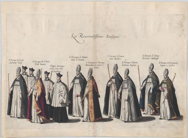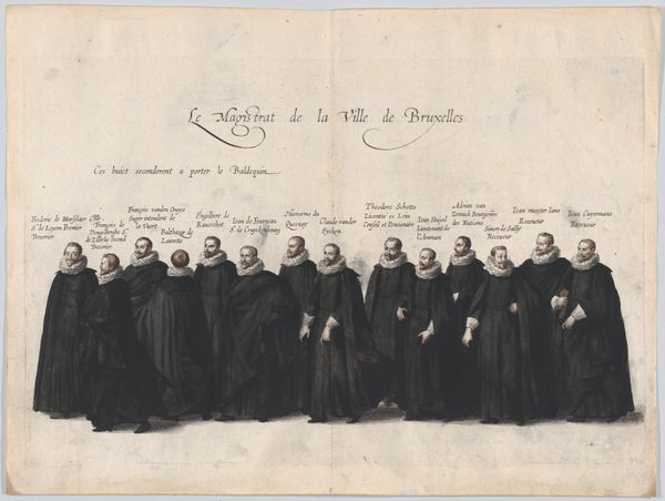 Cornelis Galle I created this print, "Plate 6," part of "Pompa Funebris ... Alberti Pii," which captures the funeral procession of Archduke Albert of Austria. The composition is neatly divided, presenting a visual study in contrasts of light and dark. Observe how Galle uses contrasting tones to distinguish the choir members. The choristers on the left wear bright white robes, creating a visual lightness that contrasts with the heavier, dark robes worn by the musicians on the right. This division emphasizes a hierarchy within the chapel, highlighting the structure of the court. The artist uses repetition and symmetry to organize the subjects, presenting them almost as architectural elements. This structured arrangement conveys a sense of order and formality, reflecting the solemnity of the occasion and the rigid protocols of the court. The stark contrast and calculated layout suggest a society deeply entrenched in tradition, seen through a lens of visual and social stratification.