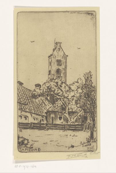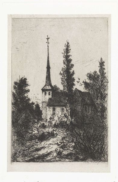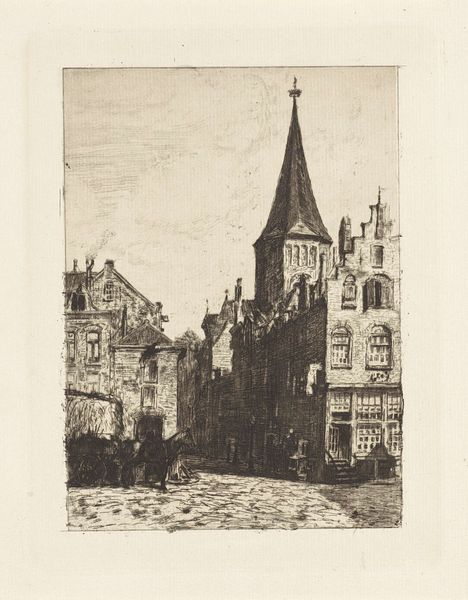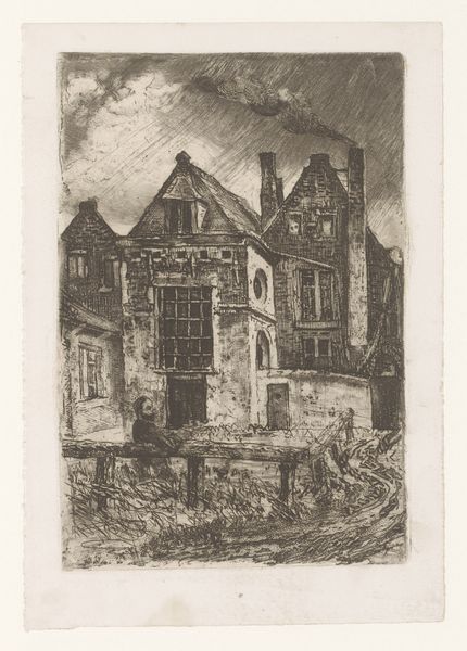 Curator: Let's turn our attention to "Toegangspoort naar een kasteel," or "Gateway to a Castle," an engraving crafted between 1830 and 1899. It is held here at the Rijksmuseum. Editor: There's a melancholy beauty to it, I think. The composition is interesting with the gate off-center and a lone figure crossing the bridge. And yet, the scene still conveys an austere beauty. Curator: The artist, Alexander Schaepkens, employs a fine level of detail given that this is printmaking. We see great attention devoted to the brickwork of the structure, but also the etching marks that create atmospheric perspective. It is likely influenced by the Romantic movement’s fascination with medieval themes. Consider, too, how easily prints could circulate. Editor: True, printmaking allowed a broader distribution and therefore also influenced what themes were considered popular or noteworthy in culture. It gives the average person more connection to powerful social structures. What about the semiotic implications here? The archway functions almost like a proscenium framing the entry into the unknown—a symbol of transition. Curator: Precisely. But transition, to what, and for whom? Let’s also consider what "history-painting" signified then, as a reflection of both artistic skill and patronage; who commissioned it? Was it to romanticize the feudal system and monarchy? Editor: From a purely visual standpoint, Schaepkens created wonderful depth, playing with light and shadow so our eyes wander into and then over the tower to observe a delicate play of light across the textured façade and how its structure plays with the landscape itself. Curator: Indeed. I think our understanding deepens when we probe who this imagery was intended for, what social structures made such prints desirable objects, and how it may speak to the politics of its day. Editor: I'm struck once again by the power of its architectural lines and its emotive force, which transcends any immediate historical meaning.