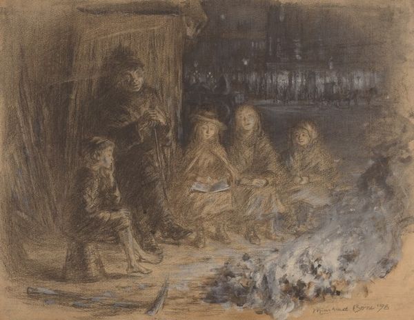 Curator: Well, right off the bat, this charcoal drawing titled "Putting a Propagandist Under Arrest" by Ilya Repin strikes a somewhat gloomy note, doesn't it? It's almost like walking into a dimly lit stage play mid-scene. Editor: Exactly! It’s a haunting piece; I am really feeling the dramatic tension emanating from this circle of individuals and the individual held within. The figures look almost ghostly, shrouded in greys. The composition seems so claustrophobic, like something momentous is unfolding in real-time in a closed room, while at the very bottom foreground, there is an unsettling image of a toddler playing alone as though this central historical and dramatic event happening above him is no more of a deal to him as a cat scratching itself. I just want to pull away and avert my gaze away from their reality. Curator: Repin, created this piece in 1879. Knowing that historical context allows us to delve deeper into its possible meanings. We understand that during Repin’s time there was considerable political upheaval in Russia. Now, do the faces begin to tell us more? Do they seem individualized, representative, even archetypal? Editor: Absolutely. You've got these figures staring with accusatory fear at the 'propagandist', while others appear merely curious or bored, almost like rubberneckers. You see a variety of people drawn here—social archetypes maybe—as stand-ins and representative of their era. A baby and his mother in the background who lives with them, for one, seem very afraid for the propagandist that they probably live with. Even with this bleak, ashy palette, Repin still creates the illusion of unique personas. Curator: He captured that complexity using such simple materials, focusing primarily on shadow and light. He evokes this sense of narrative. It also shows how art functions as a potent cultural mirror reflecting our societies back at us. We must analyze how it works through art to reveal social, cultural, and historical continuity as well. The work evokes, in this way, Russian culture, anxieties, hopes, or traumas... Editor: I feel as though Repin managed to make us uncomfortable onlookers; almost complicit somehow with what we're viewing and forced to consider our views. And for that alone, I find the piece so potent and worth contemplating further, beyond the initial discomfort and aversion that its content provokes within me. Curator: Indeed, It is more than just an artistic snapshot; this drawing captures and compels further reflection on propaganda, its implications and potential interpretations through changing times.