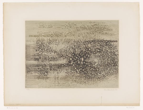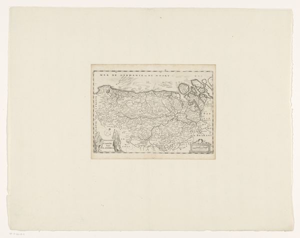 Curator: It’s densely detailed. A spiderweb of tiny marks, like a miniature world meticulously rendered. The aging of the paper lends a feeling of fragility to something that was probably intended to communicate strength and dominance. Editor: We are looking at “Kaart van Frans-Vlaanderen,” or “Map of French Flanders,” an ink and engraving print on paper, estimated to have been created sometime between 1635 and 1696. It’s currently part of the Rijksmuseum's collection. Let’s unpack the history. Curator: Absolutely. It's critical to see this map, not just as a geographical representation, but as a visual assertion of power, an attempt to define and control territory through representation. Who held the power to commission such a map, and who was it meant to serve? Editor: Precisely. Maps, especially during this period, were instrumental in solidifying claims of ownership and political influence. This specific map shows French Flanders during a time of considerable geopolitical upheaval. Its creation coincides with various conflicts between France and the Habsburgs, as each struggled for territorial control. The political messaging behind its production can't be ignored. Curator: And consider the presumed audience. While appearing “objective,” maps always embody certain perspectives and biases. For example, to whom does this rendering give visual priority? Does this benefit merchants, the military, the colonizers, or the colonized? Editor: These maps were tools, used to legitimize state power and imperial ambitions. Moreover, analyzing the cartographic conventions of the time also unveils the development of scientific methodologies in parallel with colonial expansion and capitalist aspirations. Curator: The choice to represent terrain, waterways, and settlements reflects contemporary values and geopolitical goals. The presence and style of heraldry and embellishments indicate intended prestige and ownership, shaping public perception of that territory. Editor: Maps of this period served purposes far beyond mere wayfinding. Examining “Kaart van Frans-Vlaanderen” forces us to think about cartography’s deep ties to political ambition, and how the simple act of mapping can profoundly influence society. Curator: It encourages me to revisit and critically analyze the very nature of maps and territorial representation. Editor: Indeed, turning a reflective lens towards such items gives them fresh context.