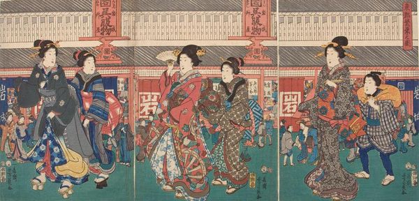 Curator: This is Yashima Gakutei’s print, depicting “Courtesan Hitofude of Tamaya with Attendants on the Way to the First Writing of the New Year.” It's a charming composition. Editor: Charming, but also quite complex! I immediately notice the patterns—the interplay of geometric and floral designs on the kimonos. What's the significance of the Kakizome? Curator: It was an important New Year's tradition. This print offers insight into the cultural practices and social hierarchies of the Edo period. Editor: And the poems inscribed on the artwork, could you read them as clues of the scene? Curator: Indeed, the poems, inscribed in the upper left, add another layer, connecting the visual image to the literary culture of the time. Editor: The formal arrangement really underscores the social roles at play. I find myself contemplating this intersection of art, text, and lived experience. Curator: A valuable point, offering a rich perspective for considering this image.