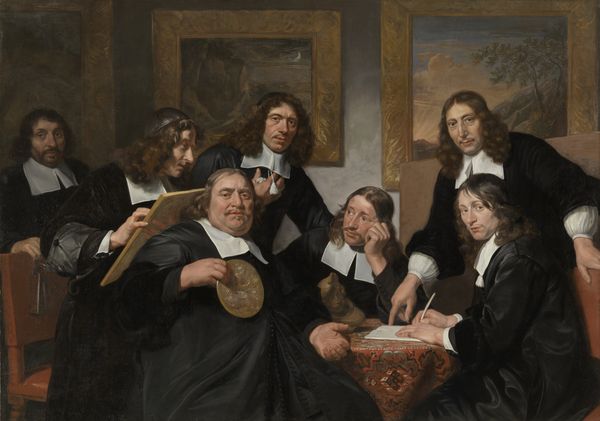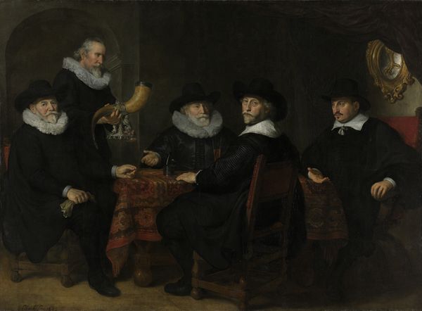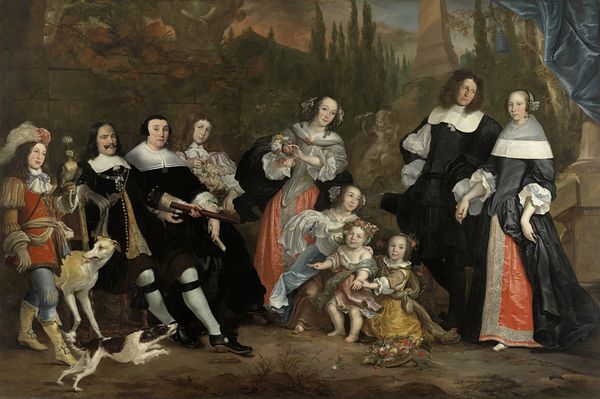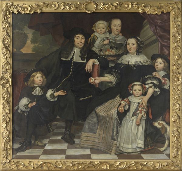 This is Jacob Fransz van der Merck’s “Family Portrait,” an oil on canvas work dating from the 17th century. A muted palette of dark blues, reds, and blacks dominates, offset by the stark white collars of the figures. The composition is rigidly structured, dividing the space into distinct zones, each occupied by a family member. Notice how the gaze of the subjects guides your eye, creating a semiotic interplay between the figures and the viewer. The formal poses and the inclusion of symbolic objects, such as the fruit, underscore notions of prosperity and familial harmony, reflective of Dutch societal values at the time. Consider the formal constraints of the portrait genre itself, and how the artist uses these to negotiate between individual likeness and broader cultural ideals. The damaged face of the man, however, disrupts this sense of order, introducing an element of instability that undermines the family's confident display of status.
