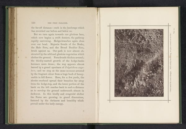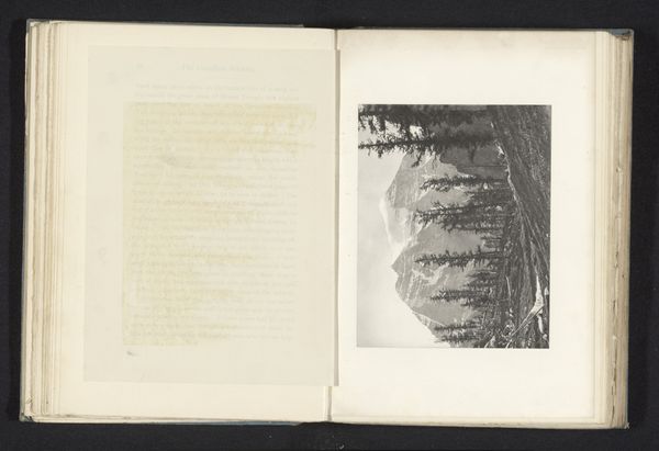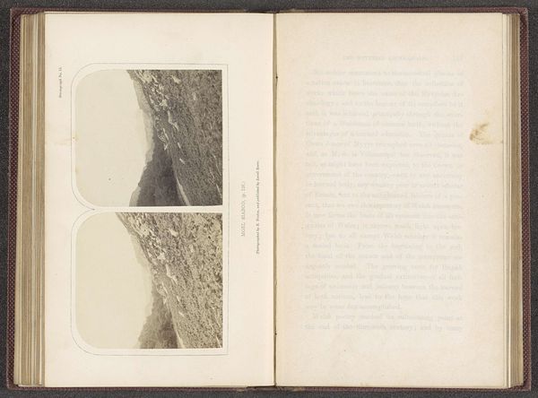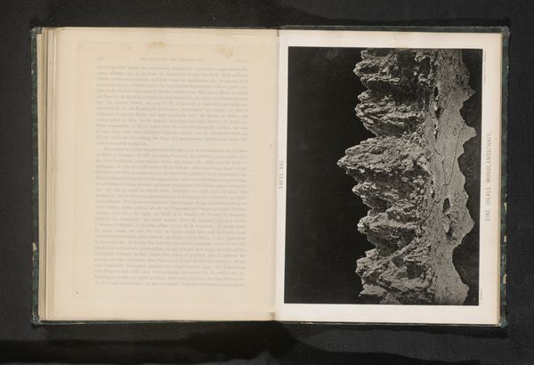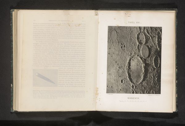 Curator: So here we have "Gipsmodel van een maankrater," a plaster model of a lunar crater, created before 1873. The artist is James Nasmyth. It is on display here at the Rijksmuseum. Editor: Oh, wow! At first glance, it feels like I'm peering into some ancient, otherworldly wound. So stark, you know? The contrasting blacks and whites give it an almost unnerving intensity. Curator: Exactly. What you're seeing is a product of Nasmyth's particular method. He was intensely interested in making the cosmos knowable, using photography of models and detailed etchings to investigate what had previously been inaccessible to most. He painstakingly constructed plaster models based on telescopic observations, then photographed them to create the illusion of actual lunar landscapes. Editor: I find it incredibly clever – using earthly materials, the humble plaster, to depict something so utterly remote! I mean, the texture is uncanny. It actually looks more convincing than some modern digitally enhanced images of the moon. It's wonderfully lo-fi yet evokes such grandeur. Curator: Absolutely. Nasmyth's technique allowed for controlled lighting and shadow, emphasizing the textures and contours of the craters in a way that pure telescopic observation sometimes couldn't. And this particular print – well, the Rijksmuseum attributes it as a photographic print or perhaps even an etching. It embodies that Victorian fascination with both scientific accuracy and artistic interpretation. The intersection of those disciplines, you might say. It challenges our contemporary view of the photographic medium by exposing it as just as manipulated, as “constructed,” as anything else. Editor: True. This print being on the opposite page to that period script...there is something deeply evocative about seeing text from a different time trying to describe and grapple with an object millions of miles away. Almost like these crater walls aren’t on the moon, but instead represent knowledge, learning and time itself. The material book makes for a good support. Curator: And in terms of audience experience, imagine seeing this reproduced in books; a real democratizing force in Victorian science. It would have opened up an entirely new world of study. Editor: Well, seeing this artwork today reminds me that, really, we’re still figuring out how to look at the universe and everything inside it. So in that sense, I appreciate Nasmyth offering a material solution for depicting a complex problem. It's very much punk space exploration if I could say so! Curator: I agree entirely. It's a fascinating confluence of craft, science, and imagination. A beautiful artefact about the construction and labor of image-making, ultimately.