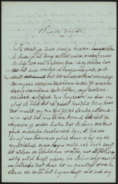 Curator: This appears to be a letter, or perhaps a draft of one, judging by the loose composition and the handwriting. Its value lies not in pictorial representation, but in its textual presentation and semiotic texture. Editor: You're right, it seems like an informal note rather than a finished artwork. It's called "Brief aan Etha Fles" by Jan Veth, made with ink on paper between 1874 and 1925. The handwritten style gives it an intimate feel. How do you read this piece purely from its visual elements? Curator: Observe the consistent flow and even distribution of the inked script across the paper. The artist has harnessed the grid to align the baseline to give order to this plane of written information, a gesture further solidified by the title set distinctly at the top of the paper. Do you see a clear distinction between foreground and background? Editor: Absolutely, the text, of course, is the figure, and the lined paper the ground, like an organized support system. Is the *idea* of the correspondence just as significant as its execution? Curator: Precisely. Veth has chosen a readily available, economical support that reflects the direct purpose of written exchange. The starkness of the black ink against the light paper amplifies the directness of communication. The work uses written language not just to inform, but to constitute its form. Consider how the rhythm and density of the writing create a unique visual experience, something beyond the words themselves. Editor: That's fascinating. I had initially viewed the text as separate from the artistic aspect, but it sounds as though Veth blurs these. It highlights that letter-writing is, in itself, a creative act. Curator: Yes, exactly. Understanding this work allows us to look more carefully at all forms of inscriptions, seeing language not just as a communicative medium, but also as an aesthetic building block of the composition itself.