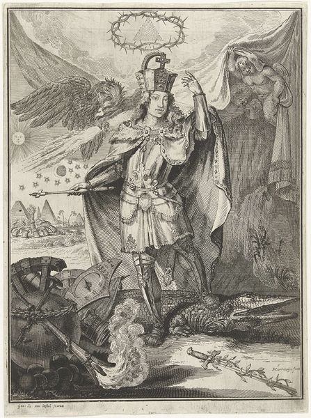 Editor: So, this engraving is called "Heilige Pascal Baylon knielt voor engel met monstrans," depicting Saint Pascal Baylon kneeling before an angel, made by Giovanni Domenico Tiepolo sometime between 1768 and 1772. It’s quite striking with the dramatic lighting and the intense devotion captured in the saint's posture. What jumps out at you when you see it? Curator: What immediately grabs me is the blatant display of power and its reinforcement through visual imagery. The angel, suspended above the saint, holds the monstrance – a clear symbol of institutional authority within the Catholic Church. Consider the political climate of the late 18th century, with rising challenges to religious power. Do you think this image subtly reaffirms the Church’s dominance? Editor: That's a really interesting point. I was focused on the saint's personal experience, but I see what you mean. It's not just a depiction of religious ecstasy; it’s also about reinforcing a power structure. Curator: Precisely. Notice the architectural details in the background, fragments of classical design – perhaps signifying the long-standing history and presumed legitimacy of the Church itself? Also, the saint is kneeling amongst discarded armour. What socio-political reading can we derive from this specific placement, and whom is the picture intended to address and impress? Editor: Hmm, it could suggest the triumph of faith over worldly power, symbolized by the abandoned weapons? I hadn’t considered that before. The engraving’s purpose might have been to inspire and remind viewers of the Church's enduring influence. Curator: Exactly! Images like this played a significant role in shaping public perception and maintaining social order. It underscores the visual vocabulary the Church employed to bolster its influence in a changing world. Editor: Wow, I've definitely learned a new way to look at religious art! It’s so much more than just a devotional image; it's a political statement too. Curator: It is, indeed! Recognizing that art functions within historical power structures enables richer readings. Always ask, "Who benefits from this image?"