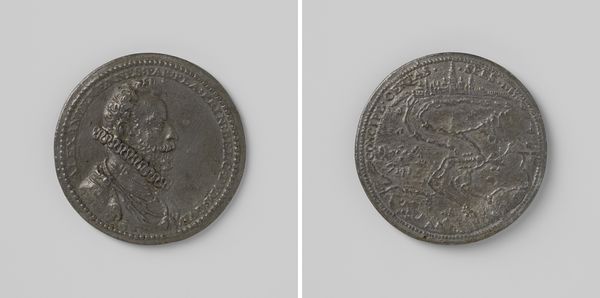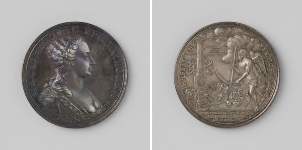 Editor: Here we have a metal relief sculpture from 1712 entitled "Marie Louise, weduwe van Johan Willem Friso" by Monogrammist IWV. I'm immediately struck by its diminutive scale and the incredibly fine detail rendered on what looks like a coin or medal. How do you interpret this work? Curator: It speaks volumes, doesn't it? This isn’t just a portrait; it’s a statement, frozen in time. For me, the piece whispers of power, of lineage. Notice how Marie Louise is depicted—the rigid formality of her pose offset by the softness of her features, the elaborate hair... Then there's the inscription ringing her portrait. The details are more interesting than the portrait. Look at that tiny script! Almost impossibly small for such a work, no? Editor: Absolutely. It feels like everything is deliberate, a careful curation of image and identity. What do you think the inscription and heraldry convey about her? Curator: I think you got it! Exactly! The heraldry broadcasts her heritage and the weight of her responsibilities after her husband's tragic death. It served as both a public declaration of her position and perhaps, more intimately, a reminder to herself. There's strength there. I wonder, what’s the vibe you’re getting from it? The woman looks so proper... so above-it-all… Editor: I agree, but also I sense vulnerability. Perhaps it’s the knowledge of her widowhood coloring my view, but behind the Baroque excess, I imagine a very human figure. A real tour-de-force on metal, really! Curator: Yes! I think the metal embodies her resilience! Editor: I appreciate your insights into its historical context. It really opens up new avenues for understanding its complexity! Curator: And for me, you pinpointed that thread of vulnerability I might have overlooked in favor of its visual spectacle. Collaboration complete!