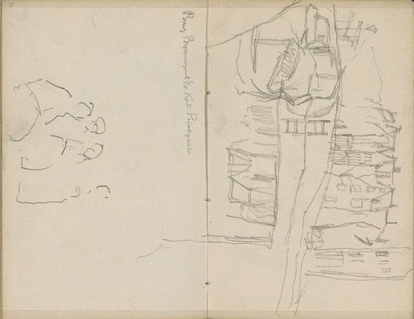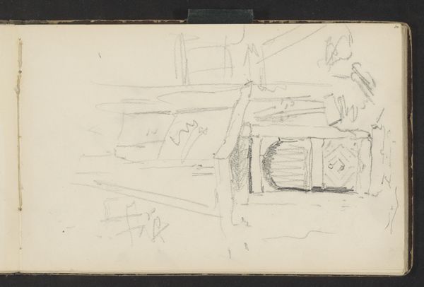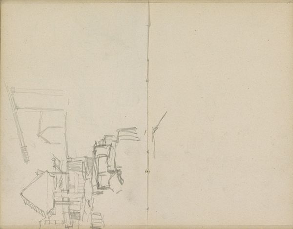 Curator: Breitner's sketch of the Sloterdijkbrug in Amsterdam, probably dating from somewhere between 1907 and 1911, offers a fascinating glimpse into his working process. What jumps out at you? Editor: It's haunting, isn't it? That stark, almost skeletal quality... It feels like a ghost of a place. There’s this big emptiness that dwarfs the bridge structure itself. And look, the book is open and nearly empty too: a conversation between something that already exists (bridge) and something about to come (Breitner's intervention). Curator: Precisely. Breitner, a staunch advocate for capturing the immediacy of urban life, employed sketching as a vital tool. Note the directness in his style—minimal embellishment, just raw observation. He was deeply embedded in Amsterdam's visual culture, especially known for portraying ordinary folks in this time. Editor: So he saw the city as a landscape to document. It’s like he’s asking us to pause and look closely at the ordinary structures that shape our lives, literally a bridge between neighborhoods, the human and the engineered. And maybe even questioning how those things become entwined. Is that what it feels to document his everyday reality? Curator: He was interested in this precise idea. Remember, the Rijksmuseum's holdings reveal just how committed Breitner was to realism, and his choice of such everyday subject matter placed him amongst the artistic avant-garde. And remember, photography at this time starts playing a major role for representing "reality" for artistic reference. Editor: It’s funny, you mention the realism; to me it feels like a starting point—a springboard. Breitner’s left so much space for interpretation. It feels almost…abstract in its incompleteness. In leaving out all that information, all that “realism”, that gives space for my emotion to fill in the blanks. It goes both ways, you know? Curator: It's like he deliberately provokes a response by holding back. His style was influential amongst younger generations. But look at those almost architectural lines! These works ended up framing perceptions of Dutch urban environments and society at the turn of the century. Editor: He provides enough clues to begin that engagement. Looking closer it is a potent reflection of his society. Breitner prompts us to consider the poetics of urban space through very little information. It shows the artist as part seer, part social commentator. What can we make of that relationship? Curator: That's it exactly! A testament to the power of suggestion. Editor: Absolutely.