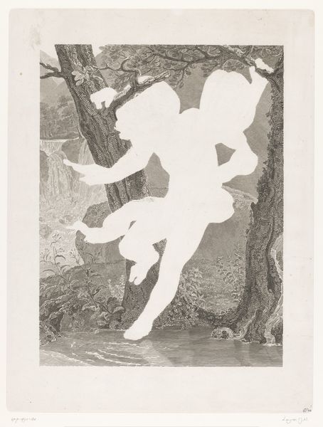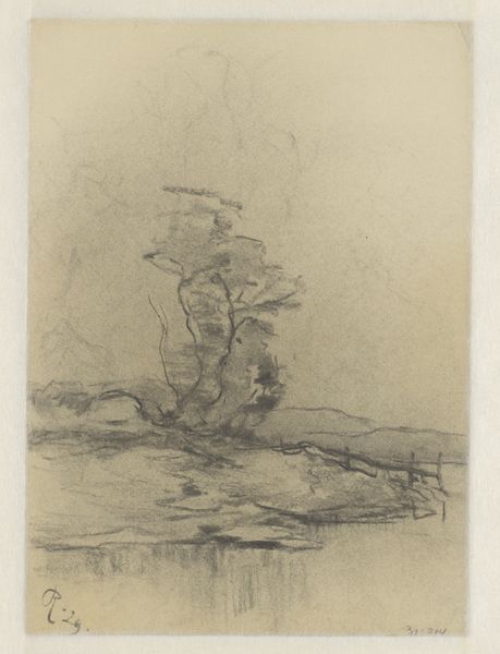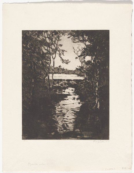Editor: Here we have "Bathing Woman in Nature" by Henri Patrice Dillon, created around 1902. It's an ink drawing, mostly monochrome, with Art Nouveau and Symbolist influences. What strikes me immediately is its almost dreamlike quality – the woman emerging from this dark, evocative landscape... what do you see in it? Curator: It pulls me in, doesn’t it? That interplay of light and shadow! Notice how Dillon uses ink to create a world that’s both inviting and slightly unsettling. For me, it speaks of hidden desires, that sense of vulnerability one feels when truly alone in nature, reflecting on who they are, almost reborn from it. Do you find any of those ideas resonating with you? Editor: I hadn't thought about vulnerability so directly, but it makes sense. Her posture is contemplative, almost as if she’s in conversation with herself or nature. How does the Art Nouveau style influence the way we read the landscape? Curator: Art Nouveau, with its flowing lines and organic forms, often blurs the distinction between the human figure and the natural world. The woman becomes an extension of the landscape, further intensifying this sensation of being enveloped, immersed. It’s less about a specific place and more about a feeling, a mood. A secret self is reflected on the lake as she gazes. And for what purpose? Editor: It's interesting how Dillon creates such depth with a limited palette and medium. I initially saw it as decorative, but I'm now appreciating its emotional depth. Curator: Precisely! Art, like life, is full of delightful little mysteries and nuances isn't it? "Badende vrouw in de natuur" teaches us to pause, look a bit longer, and dive into these uncharted emotional waters and maybe learn a thing or two about ourselves in the process! Editor: Definitely. Thanks! I’ll certainly see more every time now.