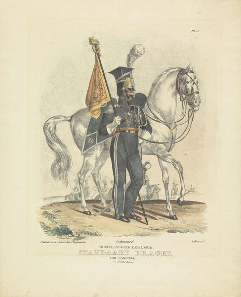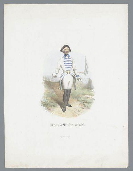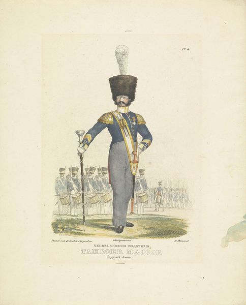 Curator: This delicate ink drawing, made between 1825 and 1827, is titled "Drummer in Full Uniform." It's attributed to A. Courtois. Editor: There's such a melancholy air about him. All dressed up, with his drum, yet the colours are so muted. It's like a fading memory of youthful bravado. Curator: Yes, the romantic undertones definitely speak to a yearning for a simpler past, maybe even a commentary on the illusion of grandeur within military life. Note the artist has chosen ink rather than vivid oil paints; it's a rather subtle, political message about the fragility of reputation. Editor: The detail on the uniform is impressive, though. That elaborate trim, those perfectly positioned buttons…such dedication to rendering the appearance of perfection, only to place it within such a wistful composition. The regiment behind the drummer seems to vanish into the horizon as ghostly and blurred images, as if a crowd of extras on a film set. Curator: Precisely! Consider the historical context. This was a time of rebuilding, of defining national identity. Images like this presented the soldier as a symbol, yet artists also critiqued this ideal. The rigid pose versus that slightly downturned gaze. A stoic façade concealing what? Editor: I keep getting drawn to his face – there's almost a look of resignation. As if he’s playing the drum, not because he loves the music, but because that’s just what is expected of him. Curator: Courtois seems to want us to see beyond the surface of duty, that maybe true strength lies not in the uniform, but the person beneath it. Editor: Beautifully put. It is as if he wants us to reconsider heroism: not about a display of external regalia, but to appreciate inner feelings and experiences. A touching representation, in a most curious, quiet manner.