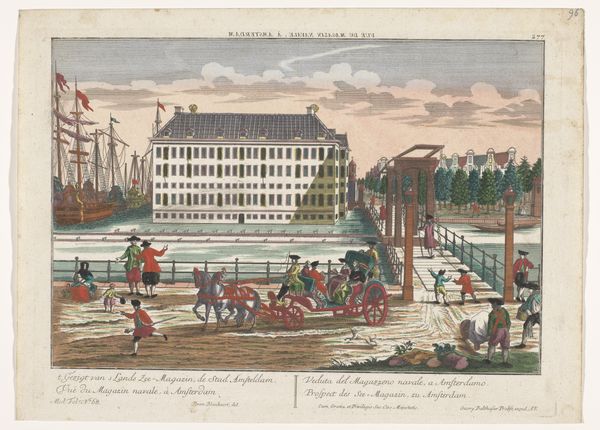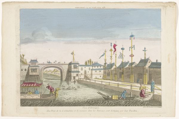 This hand-colored etching depicts a view of the Hogesluis lock in Amsterdam, made by Basset in the late 18th or early 19th century. The printmaking process is crucial here. Etching involves coating a metal plate with a waxy ground, scratching an image into it, and then bathing the plate in acid, which bites into the exposed lines. This creates grooves that hold ink. The plate is then pressed onto paper, transferring the image. The addition of color by hand adds another layer of labor, and also another layer of aesthetic interest. Notice how Basset uses delicate washes to evoke the sky, water, and architecture. The windmills in the background aren't just picturesque; they're symbols of Dutch industry and ingenuity, grinding grain, sawing wood, and pumping water. They were essential to Amsterdam's economic vitality. So, when we look at this print, we're not just seeing a pretty picture. We're seeing the intersection of skilled labor, industrial production, and artistic expression. All of which challenges the traditional hierarchy that separates fine art from craft.