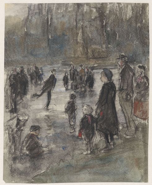 Curator: A somber and unsettling piece. It feels brutally honest, capturing the raw emotional landscape of grief. Editor: Here we have John Christensen's "Funeral in Winter" from 1928. Rendered in watercolor and drawing, it presents a chilling depiction of a winter cityscape dominated by a funeral procession. Curator: The muted palette immediately sets the tone, reflecting not only the coldness of winter, but also the emotional coldness of loss. The dark figures, almost spectral, feel weighed down by grief and possibly societal constraints on displaying sorrow. Editor: Note how Christensen employs Expressionist techniques. The distorted perspective and somewhat chaotic composition create a sense of unease. He disrupts the expected decorum associated with funerary rites. Consider, for example, the repeated symbols associated with mourning. Does the bundled black clothing act as a social imperative and signifier? Curator: Absolutely, and that’s heightened by the contrast with the occasional splash of muted red. Is that a comment on the hidden, perhaps suppressed, passion and rage within such rituals? Or on other types of sociopolitical statements related to war? The positioning of individuals within the painting suggests hierarchical observations of those permitted to show feelings vs. the labor involved in burying and thus dealing with physical consequences of mortality. Editor: The iconography suggests something complex. This landscape is fraught. Is it an outright condemnation of tradition, or a lament for what's lost amidst the machinery of social expectations and control? Perhaps it explores the duality of grief – a private torment made public. I can also read some figures holding bouquets, perhaps a comment on hope despite these funereal expectations. Curator: Precisely, hope is almost always entwined even at funerals; social gestures of mourning offer their own agency in dark times, though whether they truly disrupt hierarchies, or merely enforce and restate them, is up for debate. What do you make of the choice to focus on watercolor and drawing versus a denser, less permeable medium like oil for such a stark scene? Editor: The fluid, transient nature of watercolor mirrors the fleeting nature of life and the impermanence of earthly existence. I would even suggest it enhances the emotional impact—conveying vulnerability in the face of the inevitable. Curator: An appropriate consideration given its somber weight. Editor: Indeed, this piece seems to be asking how we create rituals and rites for dealing with impermanence.