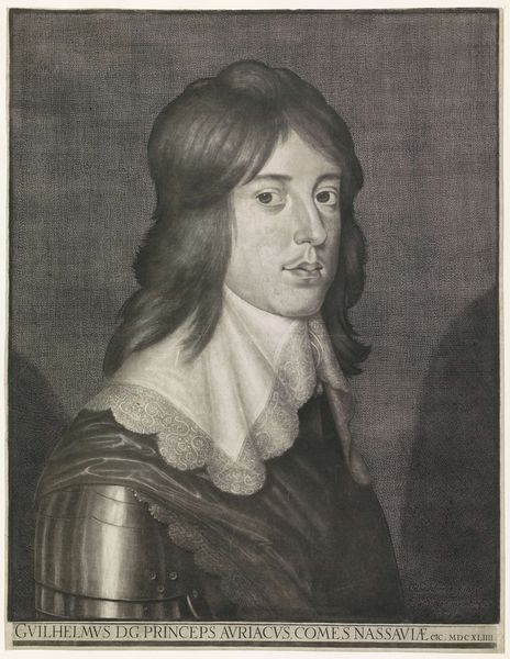 Curator: This engraving presents a portrait of Wolfert van Brederode, crafted by Theodor Matham sometime between 1649 and 1676. Editor: He looks so young, doesn't he? There’s a kind of dreamy vulnerability to the face that almost clashes with the armor. It feels staged, almost like a costume drama. Curator: The Brederodes were indeed a prominent family; portraying Wolfert in armor underscores his lineage and future role, even at a young age. Images such as these were integral in shaping perceptions and expectations. Editor: True, I suppose the armor speaks of duty, and of expectations far grander than playing in a garden, say. Do you think he chose this image or was he encouraged to appear "warrior-like?" Curator: It's highly likely that this representation was carefully constructed, bearing in mind that Matham made the engraving after a design by Jan van de Velde. A large portion of these engravings were made as a deliberate statement from his inner circles. Editor: It works visually though. The stark contrast of the ornate, soft lace collar against the hard metal plates is pretty striking. And the details! You can almost feel the weight of it all. Curator: Precisely. The baroque style evident in Matham's work here uses intricate detailing to convey both status and personality—an interesting play, given the constraints of a more standardized mode of depiction. Engravings offered accessible likeness and allowed such images to circulate widely and, of course, perpetuate political agendas and familial pride. Editor: Looking at it now, you can sense that play between reality and performance, can't you? What we see is probably more about creating an image than capturing an honest likeness, and yet that performance itself tells a kind of truth. Curator: Exactly. Understanding how art operates within societal power dynamics offers us such critical insights into not just the aesthetics but the ideologies of the past. Editor: This one does leave you thinking. It makes me consider who we choose to portray ourselves and how much of it is what people expect from us. Curator: Yes. It really highlights the way the creation of the past involves just as much editing and shaping as art-making itself.