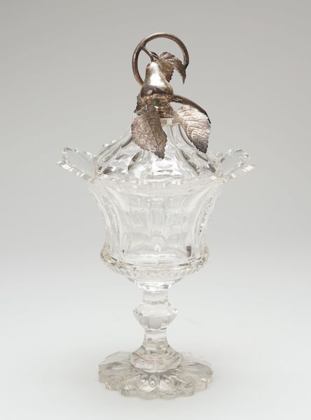 Editor: Here we have a striking glass sculpture, "Stand with St. John Nepomuk," made around 1832 by the Glassworks Harrachov in Czechoslovakia. It’s so intricate! The way light plays through the glass creates a really ethereal feeling. What stands out to you as you look at this piece? Curator: It's captivating how they’ve rendered St. John within this delicate cage. The cage itself speaks volumes; consider the historical context. St. John was martyred by being thrown off a bridge. This visual echo, this feeling of confinement, it's powerful. Do you notice the cross at the apex? Editor: Yes, it almost seems to be pointing heavenward. What does it symbolize? Curator: Precisely. It signifies transcendence and perhaps even divine approval. The stand elevates the figure, lending importance. Reflect upon the choice of glass, a seemingly fragile medium, used to depict faith. Is that contradictory or meaningful? Editor: It's meaningful! Glass is fragile, but it endures. Perhaps faith perseveres through challenges. What about the repeating geometric patterns? Curator: Ah, repetition provides stability, like echoes of unwavering faith throughout generations. The artist may be suggesting that beliefs persist. Note how the sharp cuts reflect the light—almost like a halo around St. John. Editor: It’s as if the entire sculpture radiates his holiness. This has really shifted how I understand not only the artwork, but how glass can be so much more than just decorative. Curator: Indeed, every element whispers of history, belief, and enduring memory.