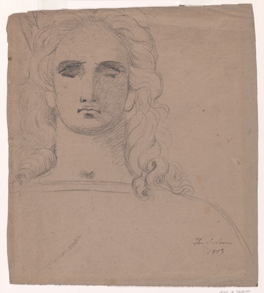 Curator: Here we have “Portrait Head of Girl,” a drawing of undetermined date, at The Art Institute of Chicago, executed in graphite and pencil on paper. Editor: It feels classical, yet almost ethereal—as if the artist wanted to capture a Platonic ideal of beauty rather than an individual girl’s likeness. There's a cool distance despite the intimate focus on the face. Curator: Indeed. The draftsmanship adheres to principles of realism, with attention paid to the subtle gradations of tone and the play of light. However, the visible gridlines disrupt the illusion, reminding us of the artist's process of construction and design. Editor: Those lines—the suggestion of underlying geometry—lend it a certain Apollonian restraint. It's interesting how they overlay onto the face, almost like a mask or template, suggesting archetypes. I'm wondering if the artist were invoking themes of youth and purity, maybe echoing Neoclassical portrayals of goddesses? Curator: It is plausible that the artist aimed to evoke associations with classical art, particularly given the idealized features and the carefully arranged curls. Note that they follow a spiral structure and appear very controlled, not at all spontaneous or wild. I suppose, a formal element that strengthens this allusion. Editor: Precisely. The formal precision gives this piece symbolic weight. The flowing, regular shapes of the hair contrasted with the angular planes of the face create a compelling tension. And although her face may appear stern and aloof, the subject has very gentle eyes, as if seeing something beautiful but far away. The gaze draws us to contemplate the meaning of serenity. Curator: The use of graphite, I would add, facilitates delicate modeling and detail, enriching its symbolic interpretation of a timeless image of youth. Editor: Overall, this artwork, by merging careful observation with idealized form, leads us to question the distinction between representation and concept. The symbol supersedes the real. Curator: I agree, an exercise in visual and structural construction and our perception thereof. Editor: Ultimately it encourages us to consider how visual codes can convey cultural values and ideas of female beauty, even now.