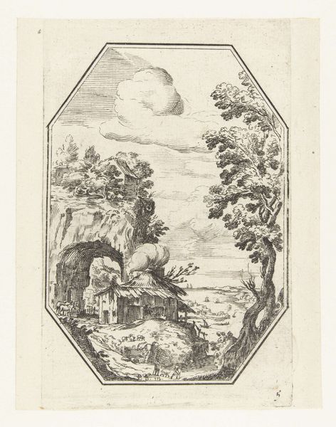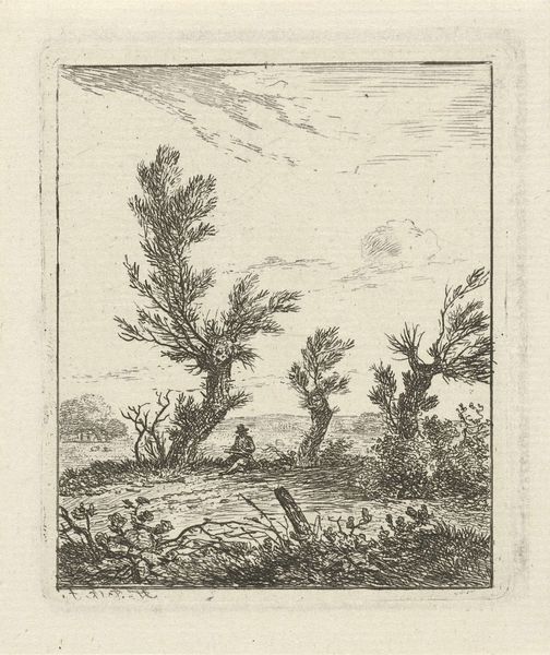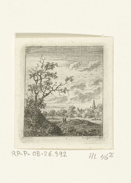 Editor: This is Ernst Willem Jan Bagelaar's "Landschap met wandelend stel", which translates to "Landscape with Walking Couple," made sometime between 1798 and 1837 using etching and engraving. I’m struck by the incredible detail created with just lines; it's delicate and evokes a sense of quiet contemplation. How do you interpret this work? Curator: I see it as a window into the burgeoning Romantic movement and its social implications. Landscape art like this was becoming increasingly popular as industrialization altered the landscape. Consider the figures; their presence anchors the composition but also highlights the idea of humanity observing, even perhaps owning, nature. Editor: Owning, how so? Curator: Think about the historical context. Land ownership, especially after the French Revolution, was a powerful concept tied to social status. These strolling figures are engaging with a landscape increasingly understood as property, not just a shared resource. And this is translated in how Bagelaar has placed this figures in the lower corner almost watching what belongs to them, in a relaxed, private contemplation. What do you think this means at the turn of the century? Editor: That's fascinating! I hadn’t considered the connection between land ownership and Romantic landscapes. So, is the etching a form of social commentary, perhaps? Curator: In a way, yes. It participates in the romantic idealization of nature while implicitly reflecting evolving social and economic structures. These landscapes served as powerful ideological tools, reinforcing certain relationships between people and the land. Look at the location where they stand: in a very relaxed position; therefore the whole scenery becomes their property. It is a subliminal language that empowers a particular message through the imagery portrayed. Editor: That really broadens my perspective on landscape art. I always saw it as simply pretty, but you’ve shown me that it can also be deeply political. Thank you for making me understand its historical importance. Curator: Absolutely! Looking at art through the lens of social and cultural history always enriches our understanding of it.