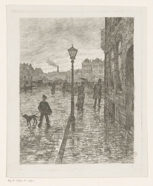 Curator: Welcome. Here we have Carel Nicolaas Storm van 's-Gravesande’s etching, “Kanaal in Dordrecht bij avond," likely created between 1851 and 1924. It now resides here at the Rijksmuseum. Editor: My first impression is the way the reflections dominate the scene. It feels like a shadowy, almost dreamlike rendering of a canal city at night, doesn’t it? Curator: It does. Looking at this, I’m drawn to the social dynamics possibly represented. Canals, bridges—they facilitate trade, encounter. Even under cover of night, these are zones of activity, even transgression, potentially blurring lines of class. What does this visual landscape say about belonging, or exclusion? Editor: An interesting point. For me, though, it is the interplay between light and dark which draws the eye so powerfully. Light reflecting on the water, creating these almost spectral images of the buildings. The architectural details above almost disappear, becoming dark silhouettes against a troubled sky. It's visually arresting. It makes me think of the symbolic weight of water; its relationship with purification and reflection... it almost implies hidden truths that await to be discovered under a reflective, murky surface. Curator: But let's consider, also, how the print medium affects how we view this artwork and how accessible it was... and what it says about the cultural significance attributed to depictions of this specific geographical place... I feel it invites one to consider the wider scope of the landscape tradition, perhaps specifically in relation to nation-building and ideas of belonging and exclusion? Editor: Indeed. Considering the medium helps understand the role and accessibility of these city images within cultural life. This, too, speaks to larger social meanings and memories surrounding them. While my take is shaped by symbols and memory and a broader emotional symbolism associated with the place depicted, yours helps to examine social-political connotations more directly, shedding valuable insights in our viewing. Curator: Agreed. Examining art through different lenses expands our appreciation, doesn't it? Thank you for sharing that interpretation. Editor: Likewise! The intersection between art and the broader world is an ongoing source of fascination.