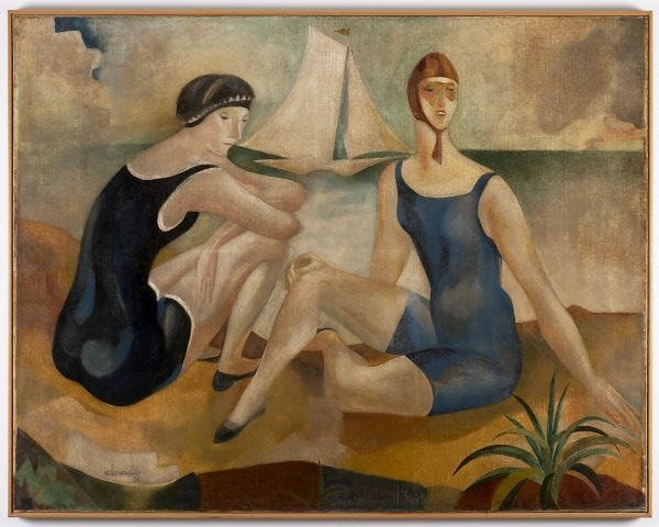 Gerda Wegener made this painting, A Summer Day, using oil paint. The way Wegener approached mark-making feels gentle, almost like she was caressing the canvas with each stroke. The color palette is soft, with a focus on pastels, which gives the whole scene a dreamy, ethereal quality. Looking closely, you can really see the physicality of the medium in the way Wegener has applied the paint. It's thin and transparent in places, allowing the underlying layers to peek through, creating depth and luminosity. Other areas, like the folds of the dresses, have thicker, more opaque strokes, giving a sense of volume and form. The way Wegener has captured the light as it filters through the trees and illuminates the figures is particularly striking. It's like she's not just painting what she sees, but also what she feels. Wegener reminds me of Tamara de Lempicka, another artist who embraced ambiguity and celebrated the complexities of female identity. Both artists challenge us to question our assumptions and embrace the beauty of multiple interpretations.