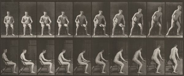 Curator: This is Plate Number 244, a gelatin silver print from Eadweard Muybridge's *Animal Locomotion* series, created in 1887. Immediately, I see an interesting sequence in its gridded, staccato effect. Editor: The rhythmic nature feels mechanical yet sensuous. A study of movement, certainly, but the model's body also evokes Victorian anxieties surrounding women's roles and bodies as sites of labor, domesticity, and shifting social norms. Curator: Exactly. Note the grid formation: it isn’t arbitrary, it meticulously isolates and captures the model's action of sitting, pouring, and drinking. This breaks down the organic flow of movement into distinct units of measurement. It allows Muybridge to examine individual phases of actions, focusing on the lines, angles and volumes made by the human figure. Editor: Indeed. We need to recall Muybridge's broader project—analyzing movement—was driven by the emerging industrial logic. His time-motion studies of both animals and humans can be read as an attempt to quantify, and, implicitly, control organic bodies using photographic technology and modern, serial forms of analysis. The woman’s nudity renders her an objectified subject under that rationalizing, modernizing gaze. Curator: Agreed. The monochromatic tone strips away superficial color, directing attention instead to the formal elements—the repetition, contrast, and the geometry formed by the body’s interaction with the table and chair. What would you say this approach offers? Editor: It compels viewers to consider power structures. While the photographic precision initially appears objective, when juxtaposed with the sitter's bare body we observe her decontextualization, turning her into a scientific specimen that arguably reduces agency rather than honoring complexity. I’d argue, then, that while these photographs explore locomotion, they’re simultaneously capturing shifting, contradictory perspectives regarding the human body. Curator: It presents an aesthetic encounter rich in visual information and a striking portrait of its era’s intersection of science, artistic inquiry and societal standards. Editor: These composite photos serve not just as an atlas of physical movement but as historical mirrors, challenging us to see how perspectives on the human body transform—or stagnate—across time.