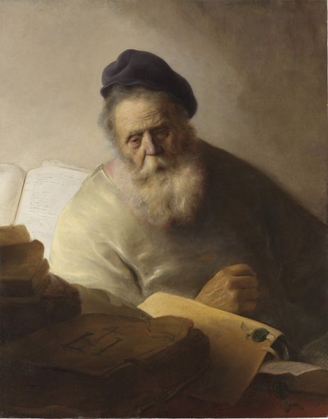 Editor: Here we have Luca Giordano’s “Philosopher,” created around 1650 using oil paint. There's such a tactile quality to the work; I'm really drawn to the wrinkles in the paper and the philosopher's aged hands. How do you interpret this piece? Curator: Look at the materials closely. The canvas itself, the pigment – these are not just passive components. How did Giordano’s access to certain materials influence the image’s final form, and how was it received by audiences accustomed to particular aesthetic values? What processes are evident here? Editor: I see the brushstrokes, especially in the drapery. They seem almost hurried, yet deliberate. Is that typical of Giordano's methods, or the period? Curator: Precisely. And what does this imply? Think about the Baroque period itself – a time of religious and political upheaval. Giordano isn't just depicting a philosopher; he’s also demonstrating a painterly technique, an act of creation mirroring, perhaps, the philosopher’s own intellectual labour. Do you see parallels between physical work and mental exertion? Editor: I do! The philosopher is laboring over the text like a craftsman at his bench. So, instead of focusing solely on the philosophical subject matter, you're drawn to how the very act of *making* the painting contributes to its meaning? Curator: Exactly. The materiality tells a story. The quality of paint, its availability, the skills of Giordano and his workshop, and finally its commodification and its accessibility to specific patrons-- it is all a record of its time. Editor: That’s fascinating. I never thought about it that way before, considering the broader social and economic context behind a work of art. Thank you for offering that material perspective!
