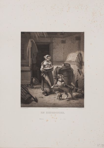 Curator: This is "En westphalsk bonde," dating back to the 1880s and created by Adolph Kittendorff. It's a lithograph on paper, housed right here at the SMK. Editor: My first impression is one of quiet observation; the enclosed space, the muted tones. The composition invites contemplation. The light focuses intensely on the faces. There’s a sense of profound, though perhaps melancholic, attentiveness. Curator: The lithographic process itself is key here. Consider the labor involved—grinding stones, meticulously applying ink, the skill needed to transfer such delicate details. The stark monochrome reflects limitations in access to material during the creation, no doubt influencing distribution too. Editor: Absolutely. And locating this image within its historical context reveals even more layers. Rural life in the late 19th century wasn't romantic. This man embodies the hardship, and the socio-political hierarchies prevalent at the time. You see a farmer but it also implies a system. Curator: Yes, the print medium was essential in disseminating such scenes beyond the elite. Its inherent reproducibility made art accessible to a broader public, potentially raising awareness of rural struggles. Think about the implications of these images entering public consciousness, challenging dominant narratives of wealth and prosperity. Editor: The father's pipe itself could symbolize comfort, escapism, even defiance amidst difficulty. The careful framing creates this space for a single moment of intense connection between generations - one weighed down by history, the other a still undefined future. And within this framework of gendered power dynamics. How are expectations forged and futures narrowed? Curator: I hadn't thought of that last point! But zooming out, how does this object exist today? The institutional context—a museum—inherently influences how we see it, don't you think? It almost neutralizes or certainly elevates something originally perhaps created to mobilize and democratize? Editor: Precisely. Seeing art, especially historical images, necessitates interrogating our own position and preconceptions in an increasingly digitized and hyper-connected world. What narratives about working class people are we perpetuating through the display, sales, distribution of historical artworks? Curator: An artwork’s life clearly extends far beyond the artist's intentions or its initial creation. I find this examination vital! Editor: As do I. Hopefully, our conversation sparks further contemplation about whose stories get told and how those stories reverberate today.