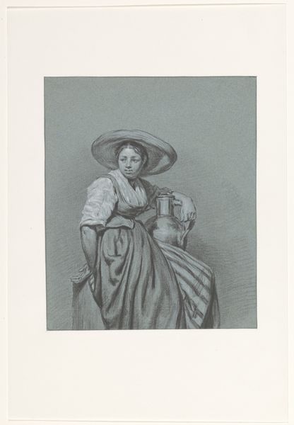 Editor: Pieter Christoffel Wonder created this pencil drawing, "Zittend meisje met hoed op en mand naast zich op de grond," sometime between 1790 and 1852. The texture looks almost photographic! But something about the young woman’s eyes gives me a feeling that she is troubled. What are your thoughts on the girl’s mood in this drawing? Curator: It's interesting you picked up on that mood. To me, she seems pensive, caught in a moment of quiet contemplation, a frequent romantic sentiment, no? Wonder uses such delicate shading with just a pencil. Look at the texture of her dress compared to the wicker basket beside her, and then the more blurred background! How do all those levels speak to you? Editor: They create such a strong sense of depth, pulling me into the scene. The basket almost feels closer than she is, which is an odd effect. What about the historical context? What do you see of the genre-painting thematics in this portrait? Curator: Well, portraiture during the Romanticism embraced emotion and individualism. The ordinary girl is placed at the center of it all. We are drawn into a quiet and simple story where the human element trumps all others. Doesn't it invite curiosity about the story surrounding this woman's daily life? Editor: Absolutely. It’s like a captured breath, a pause in her story that we’re invited to witness. Thank you! Curator: It's those pauses that make the artwork breathe.