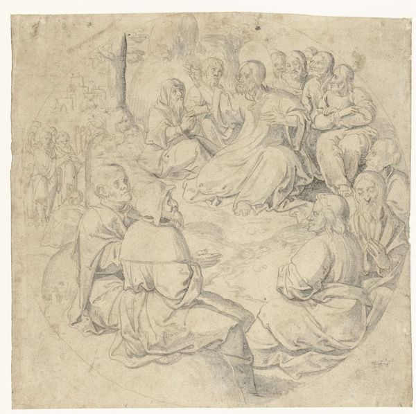 Curator: This is Hendrick de Clerck's "Eurydice Bitten by a Serpent," created between 1585 and 1629. It’s a pen and brown ink drawing over black pencil on paper. Editor: It’s wonderfully light and airy. Despite depicting such a tragic scene, there's an elegance in the figures and fluidity in their poses. The composition guides the eye effortlessly. Curator: Clerck's process is quite intriguing here. Using preliminary pencil sketching allowed for adjustments to composition before the definitive ink lines, reflective of the era's emphasis on careful preparation for paintings that had to convey social rank and value for a noble or wealthy merchant commissioning work. Editor: Exactly. The artist plays with light and shadow within the delicate framework, particularly in the drapery and musculature. Semiotically, each of those swirling lines signifies motion, death, panic... even as it exists plainly as line. Curator: Beyond the purely aesthetic, consider the social implications. Hendrick de Clerck's workshop likely had numerous assistants who performed the more routine work, thereby creating artistic value through hierarchical organization—also he was the court painter. The value judgments implicit in that hierarchy extend to our understanding of "master" drawings versus studio production. Editor: But look how the line varies in weight and texture! That modulation isn’t merely about depicting form; it's also about mood. Observe how darker contours add dramatic tension, particularly around the figures expressing visible distress. Curator: The patronage system impacted even choices about medium. Ink drawings on paper were often preparatory works or designs for engravings, thus suggesting complex interactions between commerce and artistic intention; was this ultimately intended for wider distribution through print? Editor: The rhythmic groupings of figures are crucial, with each gesture seemingly linked to a unified allegorical representation of mortal loss that, via its rendering, surpasses the specific story to communicate universal pathos. Curator: Absolutely. When viewed through a materialist lens, "Eurydice Bitten by a Serpent" reveals intricate networks of workshop practice, patronage dynamics, and early market forces— all elements integral to constructing the aesthetic qualities we experience now. Editor: Indeed, each line sings its part within a cohesive chorus, enhancing the tragic yet sublime narrative woven together. Curator: Considering Clerck’s "Eurydice" has allowed us to view the artist’s choices as functions of his working reality. Editor: And how skillfully it has allowed us to see that narrative embodied in elegant, refined shapes.