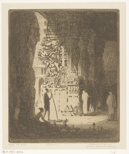 Editor: Muirhead Bone's etching from 1906, "Demolition of St. James's Hall, Interior", captures such a moment of destruction but also reconstruction. It's gritty and textured, and the scale feels enormous. I'm struck by the number of workers. What stands out to you when you look at this? Curator: I’m immediately drawn to the materials and labor visibly shaping this scene. The scaffolding, the ladders, the sheer physicality of demolition. We see the raw energy of early 20th-century urban development. Bone’s use of etching emphasizes the rough textures, hinting at the exploitation of the working class, and raising awareness of this new artistic perspective. Do you consider this to be more than just the demolition of the building? Editor: That's fascinating! I hadn't thought about it in terms of the social context. I guess I was just focusing on the architectural elements. Are you suggesting it's a critique of progress? Curator: Precisely. Bone compels us to examine the raw materials involved and the cost to labor within the industrial landscape. These kinds of prints are important historical records but also speak to broader shifts in how art started representing manufacturing, dismantling, and class in society. How do you feel that impacts our understanding of what art should reflect today? Editor: I suppose I see art as something more removed, concerned with ideas or beauty. This piece forces me to think about the relationship between art and real-world processes of construction and deconstruction and the politics related to labor. I'll remember to look for that connection going forward. Thanks! Curator: Absolutely. By acknowledging art as a product that arises from cultural materials and collective actions, we appreciate the inherent human ingenuity.