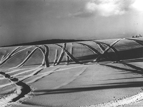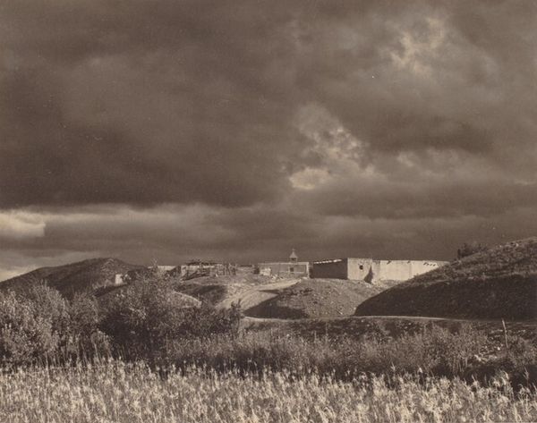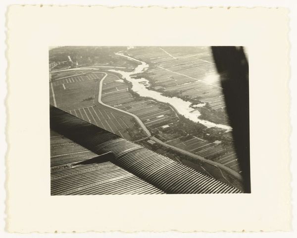 Curator: Eugen Wiškovský's photograph, entitled "The Shadow," presents a compelling composition in monochrome. The dimensions are quite intimate, only about 10 by 15 centimeters. Editor: There's something stark about this image. The geometry, the tonal range… it evokes a sense of isolation, doesn't it? Curator: The formal arrangement is quite striking. The deep shadow bisects the cultivated field, creating a powerful diagonal thrust against the horizontal architecture in the background. The textured furrows lead the eye. Editor: Yes, the buildings seem almost like sentinels, observing the landscape. Considering the historical period, it almost feels like a commentary on the peasant life under surveillance. Curator: I perceive it as a study in contrasts. The light and shadow, the organic curves of the land and the sharp, man-made lines of the buildings. Editor: A bleak but poignant landscape study, wouldn't you say? Curator: Precisely. A carefully considered composition yielding a strong visual impact.