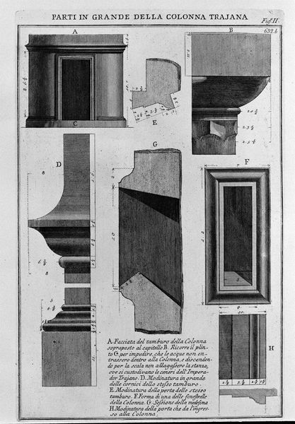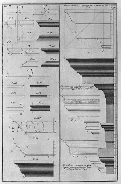 Editor: This engraving, titled "The Roman antiquities, t. 4, Plate XXXVI. Vista of a second part of the arcades of the Theatre of Marcellus," is by Giovanni Battista Piranesi. I am struck by its architectural precision. What strikes you most about its composition? Curator: The intricate linework certainly commands attention, doesn't it? Observe how Piranesi uses line not just to delineate form, but also to create depth and shadow. Note the stark contrast between the densely hatched areas and the bare paper, effectively modeling the architectural elements. How does the stark linearity impact your perception of the depicted architecture? Editor: It makes it feel very rational, almost like a mathematical equation describing the theatre. The clear lines and labeled parts create a sense of order and analyzability. But how does this purely formal approach influence your engagement with the artwork? Curator: Precisely! It encourages a close examination of the architectural forms themselves, divorced from any narrative or emotional context. We are invited to analyze the relationships between the various elements – the columns, arches, and moldings – as purely formal components. Consider, for example, how the repetition of certain shapes and lines creates a visual rhythm. Editor: That's interesting. So instead of thinking about the history of the theater, we're meant to appreciate the lines themselves. Thank you, that's helped me look at it in a new light. Curator: Indeed. By focusing on these formal elements, we can gain a deeper appreciation for the artist’s craft and the underlying structure of the architecture itself. A close inspection of Piranesi's technical skill definitely generates such profound and novel insights.
