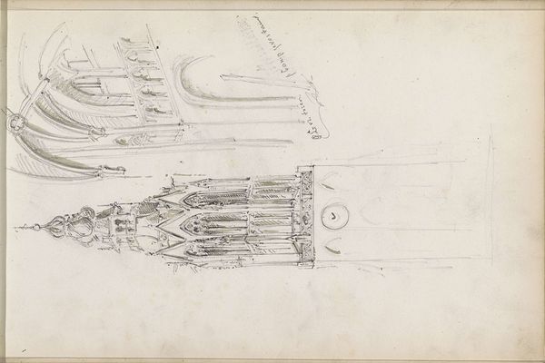 This is Pierre Cuypers's pencil design for a title page of Beethoven's piano sonatas, currently held at the Rijksmuseum. It presents an interesting interplay between music and architecture within the context of 19th-century Dutch cultural identity. Cuypers, renowned for his neo-Gothic architecture, was deeply involved in the revival of national art and heritage. Here, the design's architectural elements are visual metaphors for the structure and harmony found in Beethoven's compositions. The Gothic influences, with their emphasis on order and divine proportions, mirror the composer's own systematic approach to music. The decision to create such a design speaks volumes about the cultural reverence for Beethoven in the Netherlands, and about the social conditions that shaped art production. It also shows us the intertwining of national identity and artistic expression. Delving deeper into Cuypers's archives, and looking at the history of musical institutions in the Netherlands, would surely give us a clearer understanding of this design.
