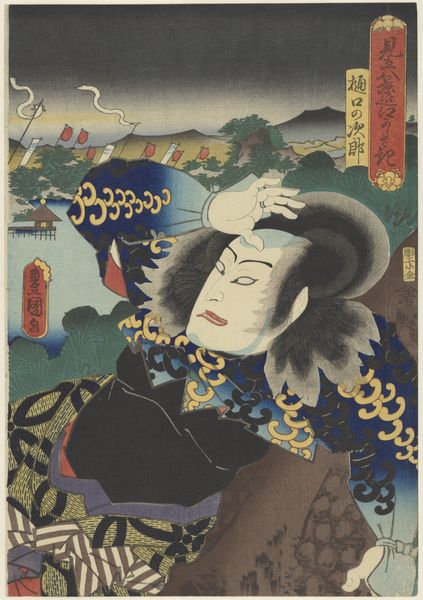 This woodblock print by Utagawa Kunisada depicts actor Bandô Mitsugorô V, likely created in the 19th century. Dominant blues and greens provide a cool backdrop, against which the figure of the actor is sharply defined. The composition is carefully arranged, balancing the actor's dynamic pose with the static text and floral elements. Kunisada masterfully uses lines to create a sense of movement and depth, especially in the actor's garments. The subtle gradations of color and texture enhance the visual interest. This contrasts with the flat, graphic quality of the text and floral arrangements. Through this interplay, Kunisada challenges traditional notions of representation by flattening pictorial space. The artwork destabilizes conventional categories by blending portraiture with theatrical and floral elements. It is a meditation on artifice, performance and visual culture. This print invites us to reconsider our understanding of image-making and the way art engages with its cultural milieu.