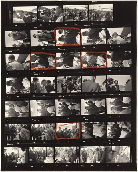 Robert Frank created this gelatin silver print, "Congressional 17," a study in contrasts and photographic language. The composition is dominated by strips of film negatives, their inherent structure creating a grid-like framework on the page. The stark monochrome palette emphasizes tonal variations, drawing attention to the granular texture of the film. Frank disrupts the conventional reading of photographic narrative. The red marks dissect individual frames, challenging any singular interpretation. This semiotic intervention forces the viewer to confront the constructed nature of meaning itself. He destabilizes the idea of a cohesive storyline, reflecting the fragmented experience of modern life. The film strip as a medium becomes both the subject and the means of deconstruction. The very form of the artwork, with its inherent seriality, raises profound questions about representation and meaning. It encourages us to question not just what we see but how we see, and how meaning is constantly deferred and re-negotiated.