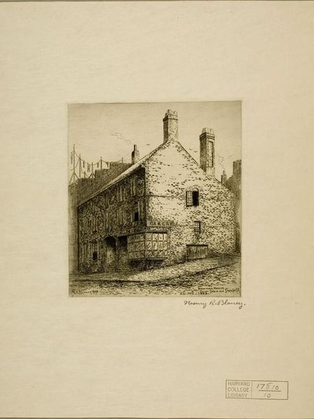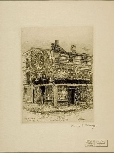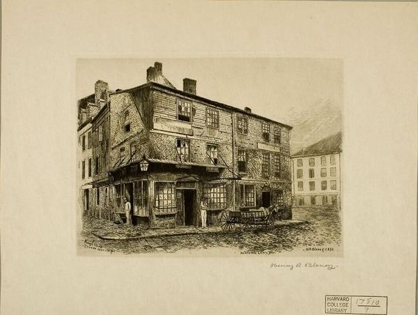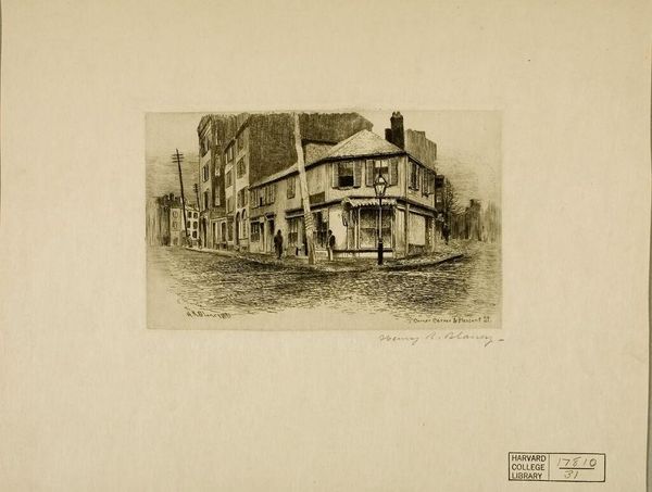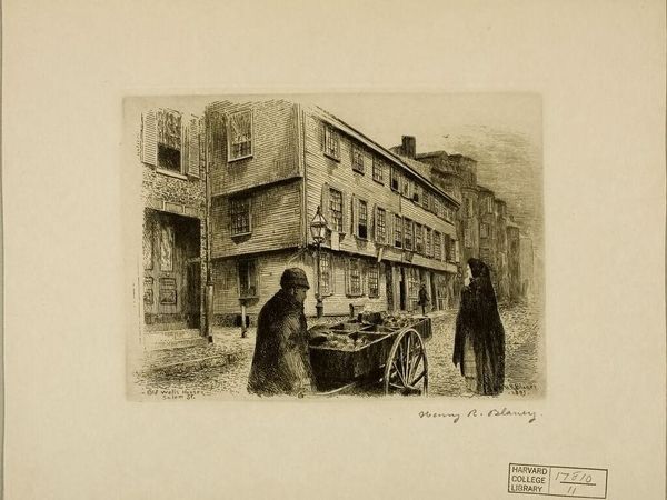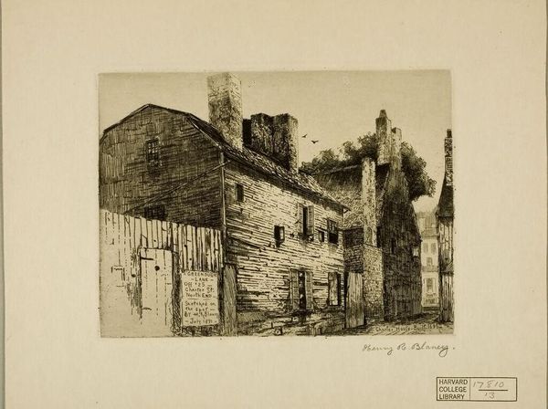 Curator: Let's turn our attention to Henry Robertson's etching, "Old House, Creek Square, No. 20," currently residing at the Harvard Art Museums. Editor: Oh, it gives me the shivers! That rickety old building looks like it's about to crumble into the creek. I can almost smell the damp wood and forgotten stories. Curator: Indeed. Robertson, who lived from 1891 to 1974, seems to capture a moment of urban decay. Etchings like this often served as a commentary on the changing urban landscape and the plight of older structures amidst modernization. Editor: I see that. There's a definite sense of melancholy, like witnessing the last stand of something beautiful and broken. The detail is incredible, every line seems to tell a tale of neglect and resilience. Curator: Exactly. Consider how Robertson's technique—the precise lines, the stark contrast—highlights the building's vulnerability and its persistence, speaking to broader anxieties about progress and preservation. Editor: Right. I will remember how even ruins can be strangely comforting, echoing our own imperfections and fleeting existence. Curator: A fitting reflection, I think.