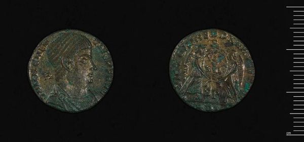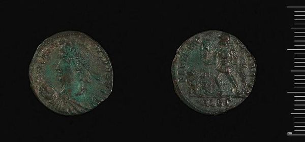 Editor: Here we have an ancient coin, specifically an AE2 of Gratian, currently residing in the Harvard Art Museums. The wear and tear speak volumes. What stories do you see embedded within this artifact? Curator: Ah, yes. The coin is not just currency; it's a symbol, almost a miniature monument. The profile of Gratian, the Roman emperor, is an idealized image of power. But the reverse side, with its likely depiction of a Roman virtue or deity, offers a glimpse into the cultural values they wished to promote. Editor: So the imagery served a purpose beyond just identifying the currency? Curator: Precisely. The images chosen were carefully selected to convey messages of strength, prosperity, and legitimacy. What do you think that those values meant for their intended audience? Editor: It’s fascinating how a small object can hold such cultural weight. Curator: Indeed, each element of the design carries layers of meaning, reflecting the hopes and fears of an empire.