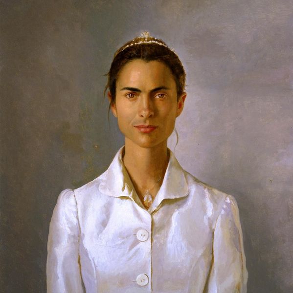 Curator: This is Claudio Bravo’s "Portrait of Maria Luisa Velasco" from 1965. It’s a rather striking piece. Editor: Striking is one word. I immediately notice the sheer amount of material in that dress – it looks almost sculptural. It contrasts dramatically with the smooth surface of whatever stone she's leaning on. What can you tell me about this artwork? Curator: Well, Bravo was a Chilean artist, deeply influenced by the Old Masters, but also operating in a moment of intense artistic and political ferment in Latin America. While many artists engaged directly with socio-political themes, Bravo focused on a highly refined, almost hyperrealistic technique. Editor: And you see that here in the rendering of the fabric – it is a masterful exercise in oil paint, isn’t it? All that texture, suggesting an unbelievable drape... I wonder about the process – how long would it take, layer upon layer, to create this effect? What type of canvas was he using, the exact pigments mixed... those questions become key to the artwork itself. Curator: Indeed. And note how the classical background portrait setting almost serves to heighten the modernism in the sitter’s hairstyle and the stark modernity of that dress, a certain tension plays across. She seems posed almost in the way a royal subject once would. The marble she rests against, the cool colour scheme, and her dark hair all work towards a kind of regal look. It creates a complex reading – a kind of homage with a clear nod to changing gendered presentation. Editor: True, the material certainly plays its part in crafting a certain narrative around status and luxury, which, I think, might not resonate easily with the working class considering the period it was made. Curator: Well, the reception was undoubtedly diverse. Bravo, despite his technical virtuosity, often faced critiques for seemingly detaching himself from the explicit social issues that dominated the Latin American art scene. Editor: Yet it’s precisely this intense focus on technique and the labor evident in the painting process that grabs my attention. It is also in her strong gaze directed out at us, one could even say that her direct expression claims a form of agency regardless of other art world politics and pressures that are in the undercurrent of the making. Curator: It makes me reconsider Bravo’s position within the art discourse of the period – and it challenges any too-easy reading of academic style as separate from the social or political sphere. Thank you. Editor: The devil is always in the details – the how of it all! And there’s plenty of room for everyone at the table.